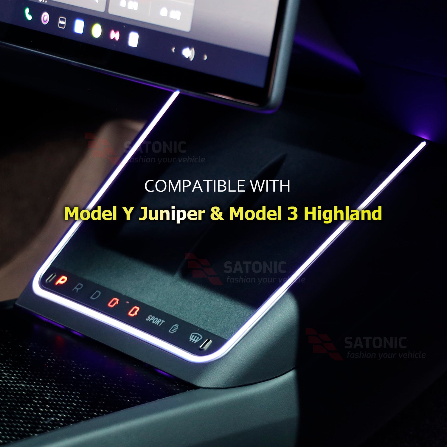 Upgrade your Tesla Model 3 Highland and New Model Y Juniper with the latest SATONIC Gear Switch Button featuring Dual Type-C Charging Ports and Ambient LED Light. Multi-functional and sleek, this wireless charger cover integrates seamlessly with your Tesla's interior. Designed specifically for the Model 3 Highland and New Model Y Juniper, it combines a gear shift button with vibrant ambient lighting. Not only can you switch gear positions effortlessly, but you can also change ambient LED colors directly through your Tesla screen. Keeps the OEM style intact—clean, intuitive, and futuristic. You’ll love it!