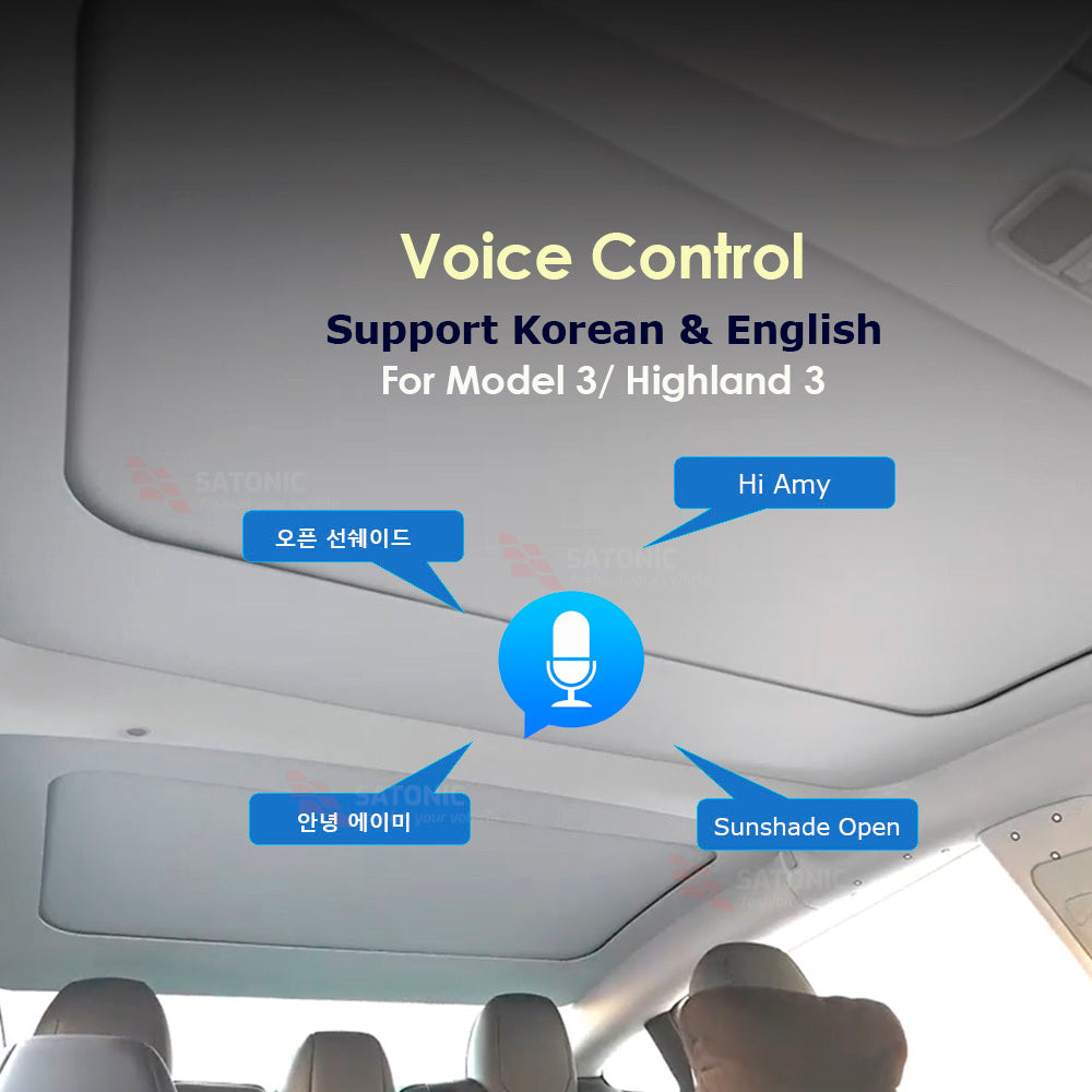 Voice Control, the Roof Sunshade, a modern solution for effortless comfort and ambiance control in your Tesla. This innovative sunshade is fully voice-activated in English Or Korean, allowing you to open and close it with just a simple command. Not only can you control the sunshade, but you can also adjust the ambient LED lighting to match your mood, whether it's a calming blue or a vibrant red.